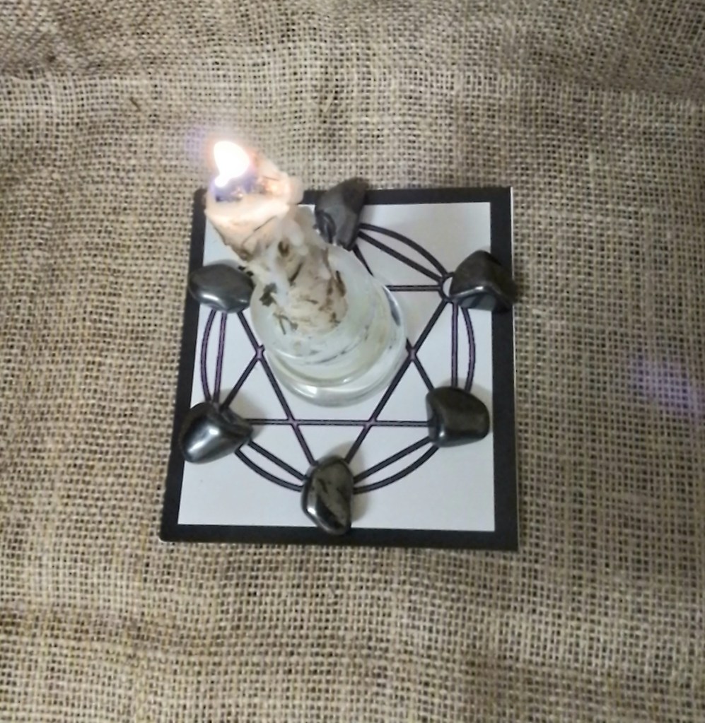 Below Hematite for protection in a Star of David shape which is also good for protection and balance with a candle designed for cleansing at the centre. The below mini grid could be placed in the corner of a healing table with your crystals and essential oils laid out. You might have a glass bowl of water and flowers with essential oils in it to bring in the emotionally healing element of water and place a feather near to the crystal grid for the air element and a bowl of salt which you could use to not only represent the earth element but to discard negative energy from your crystal as you work on the clients body. You would discard the salt at the end of your work day.
